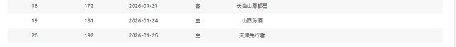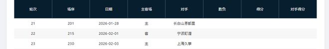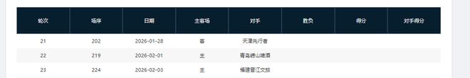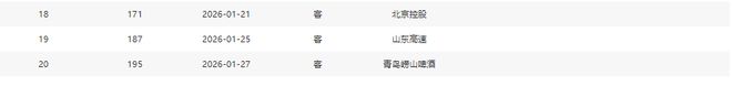 分别是客战吉林(暂居第13)、主场战山西(暂居第8)、主场战天津(暂居第16)、主场战吉林(暂居第13)、客场战宁波(暂居第11)、主场战上海(暂居第2)