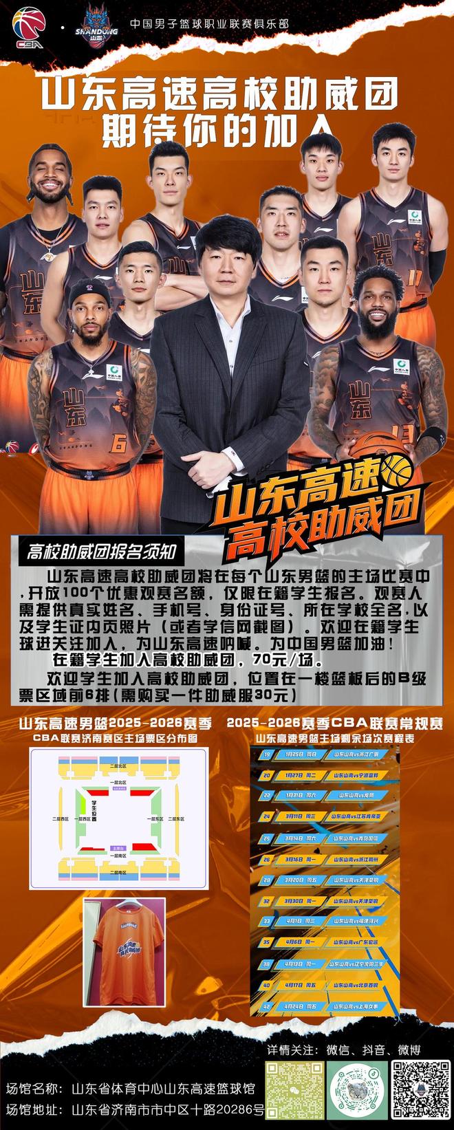 值得一提的是,1月25日晚,山东高速男篮将重返省体,迎来本赛季济南主场的首战。山东高速高校助威团将在每个山东男篮的主场比赛中开放100名高校学生助威名额,欢迎高校学生踊跃参与。