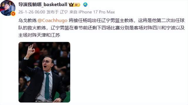 - 北京时间1月26日,辽宁官方宣布主教练杨鸣辞职暂时离开,助教乌戈暂时带队。杨鸣在其个人社媒发文:最近球队的表...发表于: 01-26 20:47