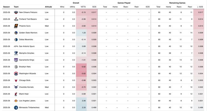 数据网站统计新赛季各队赛程难度排名:鹈鹕最艰难,掘金最轻松