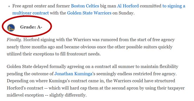 事实也是,在Shams报道之后,即便没有给出具体的合同金额(大概率就是2年1200万左右),ESPN依然给出了A级评价,这个年近不惑的老将依然全能,下赛季势必能给勇士带来巨大帮助。