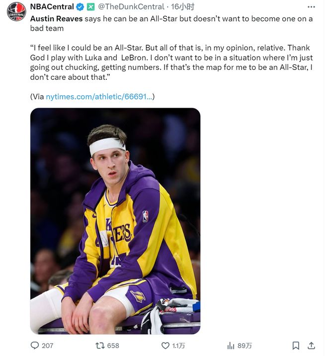 湖人后卫奥斯汀·里夫斯在接受采访时语出惊人:“我完全有能力入选全明星,但我不想靠刷数据来实现这个目标。我不想处在那种只能不断出手、只能刷数据的环境,那样的全明星荣誉我