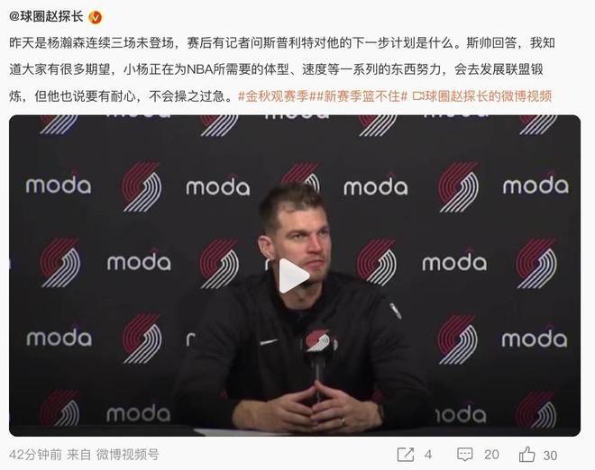 首先是球队的记者最近在社交平台透露了一个非常有意思的事情,他说他们球队的高层也注意到,在中国的社交平台有一些中国球迷指责杨瀚森不够上进,表现不够好。这位高层和队记打了一个比喻,他说没人该在马拉松开始的两分钟后就焦虑,担心中国球迷是不是有些操之过急?他还举例球队当中的夏普,这个年轻球员用了一个赛季才搞清楚自己知道在赛场上干什么,这个赛季夏普在常规赛获得非常多的出场时间和球权。