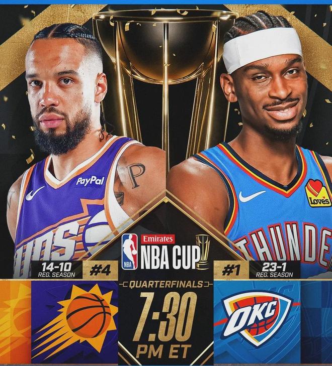 北京时间12月11日,NBA杯1/4决赛:雷霆主场vs太阳。咱们已经介绍过,除了决赛之外,其余NBA杯的比赛结果均算常规赛战绩。布克(右侧腹股沟拉伤)本场缺阵,他在赛前表态愿意出战。但太阳