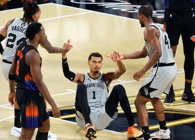 第二,马刺虽然每场都有7-8人得分上双,但突出的得分点没有,福克斯也融入年轻人,打起了团队篮球,这么做固然很好,但高端局没人站出来。第三,马刺四号位是弱环,巴恩斯攻防都比较低迷,马刺如果想尽快兑现成绩,找靠谱四号位,巴恩斯1900万到期合同不难处理。第四,文班亚马本场在场时反而输分最多,在遇到强力内线时,文班亚马打五号位有些吃力,对抗不够,侵略性打不出来。当然人无完人,只不过在尼克斯面前,这支马刺稍显的有些稚嫩。