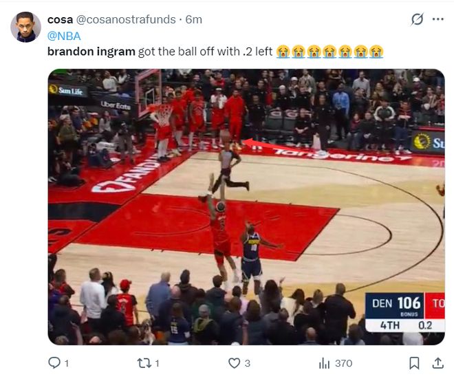 这场比赛最大的争议就是第四节结束前英格拉姆的绝平三分,布鲁斯-布朗的第二罚没中,猛龙疯狂反击冲到前场,英格拉姆漂移三分球命中,可裁判随后判定这个三分绝平超时。
