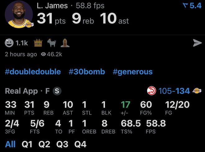 詹姆斯赛季第一次背靠背,面对近期非常猛的老鹰,而且比赛过程中还受伤但原地复出,直接打成今日NBA最佳球员,詹姆斯的数据是:32分35秒,20投12中,三分球4中2,6罚5中,31分9篮板10助攻,正负值+17——超越对手老鹰任何球员,更是比对手首发控卫沃克高出+54!詹姆斯还是提前打卡下班,拒绝刷数据。詹姆斯职业生涯这种只差1个篮板或1个助攻的超级准三双太多了,保守估计超过两位数。詹姆斯毕竟不是科比或库里,詹姆斯从来不刷数据,也不会熬工龄,他再次用实战说明了这个事实。