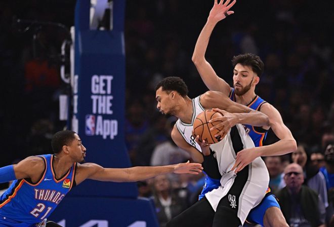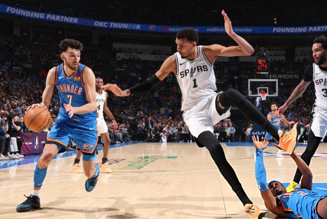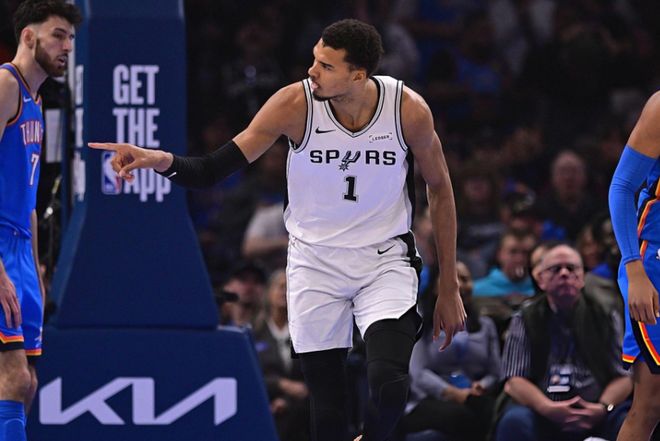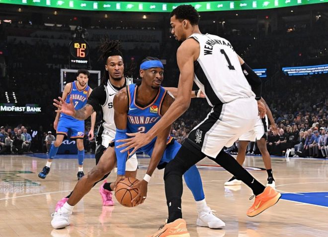 从战术打法和阵容框架来看,马刺确实克制雷霆,丰富的后场资源车轮战消耗亚历山大,文班亚马和科内特镇守篮下,雷霆还没三分投射稳定性。回顾一下比赛,文班亚马本场首发,开场文班亚马就隔扣霍姆格伦,华莱士顶投三分,文班亚马空接继续暴扣,杰威连续单打回应,亚历山大跳投,卡斯尔内突外投咬住比分。中段维金斯和哈珀对轰三分,约翰逊和哈珀带队打停马刺,但节末亚历山大联合卡鲁索打出小高潮,第一节雷霆32-26马刺。进入第二节,文班亚马挑篮+福克斯加速上篮,尚帕尼也轰进三分。