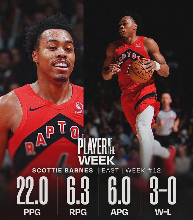 NBA官方宣布:猛龙的斯科蒂-巴恩斯当选东部周最佳球员,巴恩斯上周场均22分6.3篮板6助攻,率领猛龙3胜0负;掘金的佩顿-沃特森当选西部周最佳球员,沃特森上周场均24.5分8篮板4助攻1.3