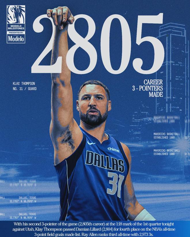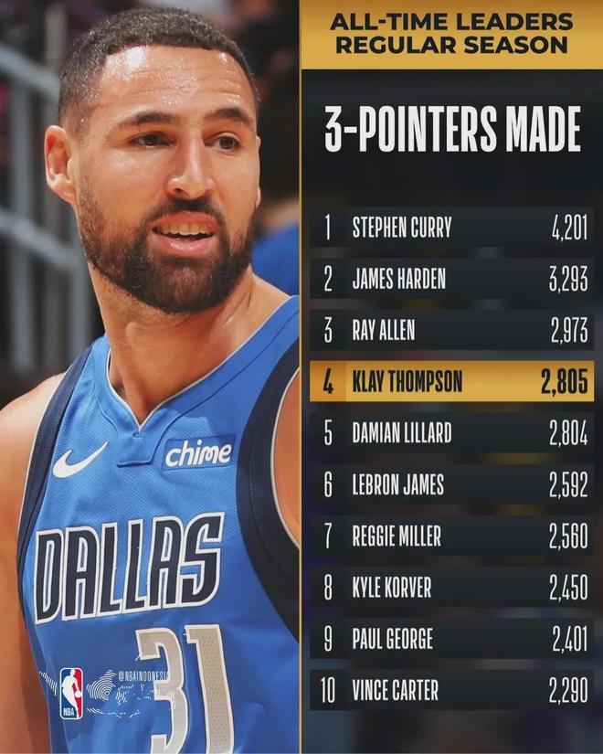 2809记三分!恭喜克莱汤普森!NBA历史三分榜第四位