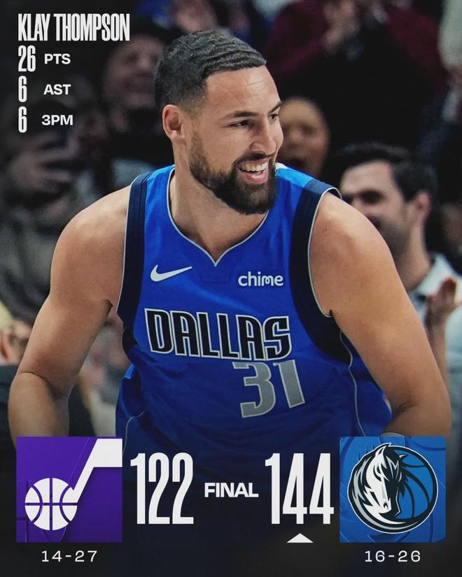 北京时间1月16日,NBA常规赛:独行侠主场144-122大胜爵士。独行侠三状元:弗拉格、浓眉和欧文均因伤缺阵,克莱-汤普森仅出战23分14秒,18投10中,三分13中6,砍下26分1篮板6助攻1抢断1盖帽,正负值+25全场最高。