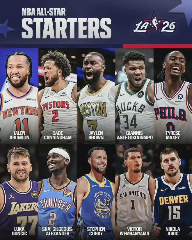 千呼万唤始出来,NBA全明星首发阵容如下:西部:东契奇+约基奇+亚历山大+库里+文班亚马;东部:布伦森+字母哥+马克西+坎宁安+杰伦-布朗。什么?活久见,太不可思议了。联盟大小王竟然同时