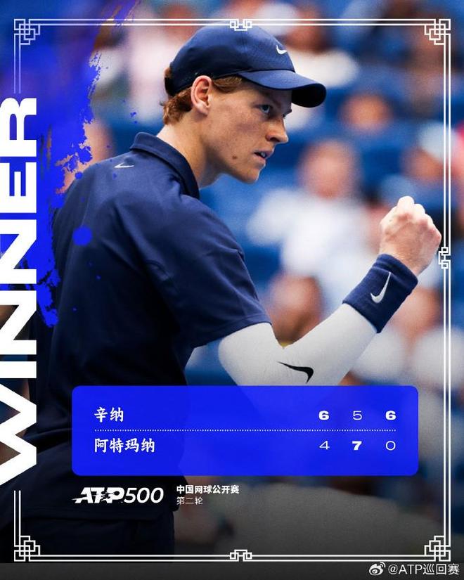 9月27日,中网男单第二轮,头号种子辛纳激战三盘,以2-1(6-4、5-7、6-0)击败资格赛选手阿特玛纳,继今年辛辛那提半决赛后再胜对手。辛纳四分之一决赛将对阵匈牙利选手马洛桑。