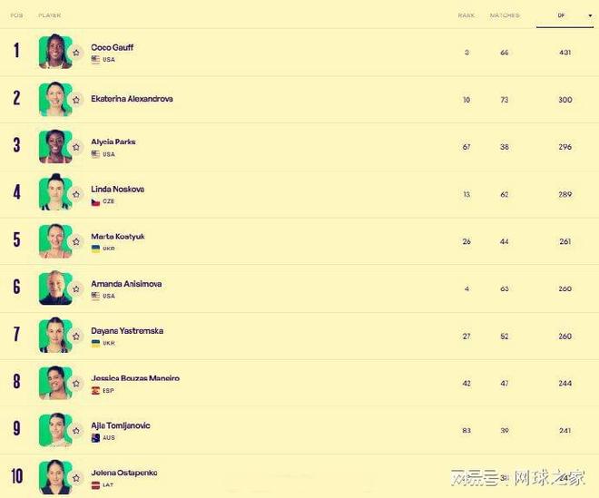 我们再来关注一项女网数据榜。在2025赛季WTA巡回赛中,谁的发球双误数最多?TOP10都有谁呢?通过数据汇总,美国一姐高芙以431个双误高居榜首。俄罗斯人亚历山德洛娃以300个双误排在次席,美国小黑帕克斯排在第三位,双误数是296个。排在第四到第十位的分别是捷克人诺斯科娃(289个)、乌克兰人科斯秋克(261个)、美国人阿尼西莫娃(260个)、乌克兰人雅斯特雷姆斯卡(260个)、西班牙人博萨斯(244个)、澳洲人汤姆贾诺维奇(241个)和拉脱维亚人奥斯塔彭科(241个)。