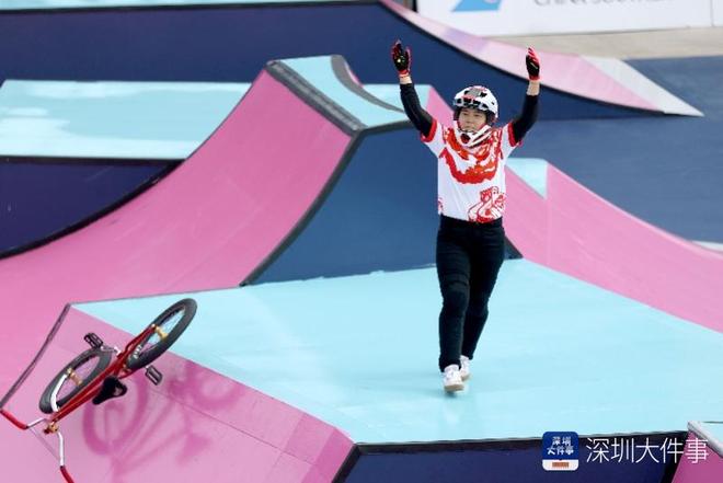 2025年10月25日,十五运会男子自由式公园赛决赛,广东队卢畅在完成动作后激动地把自行车甩向空中。