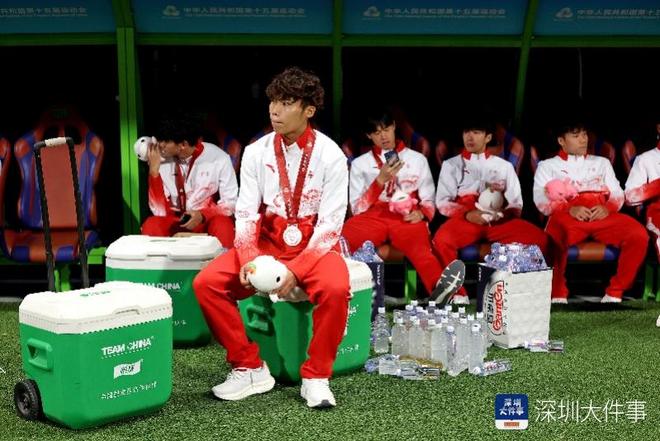 2025年11月12日,十五运会男子足球U20组金牌赛,颁奖仪式后,广东队队员失落地坐在休息区内。广东队与湖北队在120分钟法定时间内打成1:1平手,最后在点球大战中广东队以3:5落败。