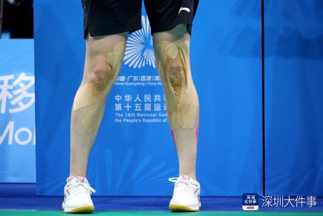 2025年11月20日,十五运会羽毛球女子双打决赛,四川队的郑雨腿上缠满了肌肉贴。