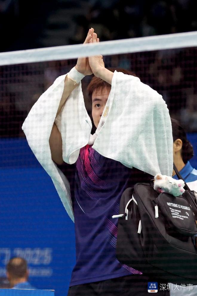2025年11月9日,十五运会羽毛球男子团体小组赛,比赛结束后,广东队梁伟铿向现场球迷致谢。