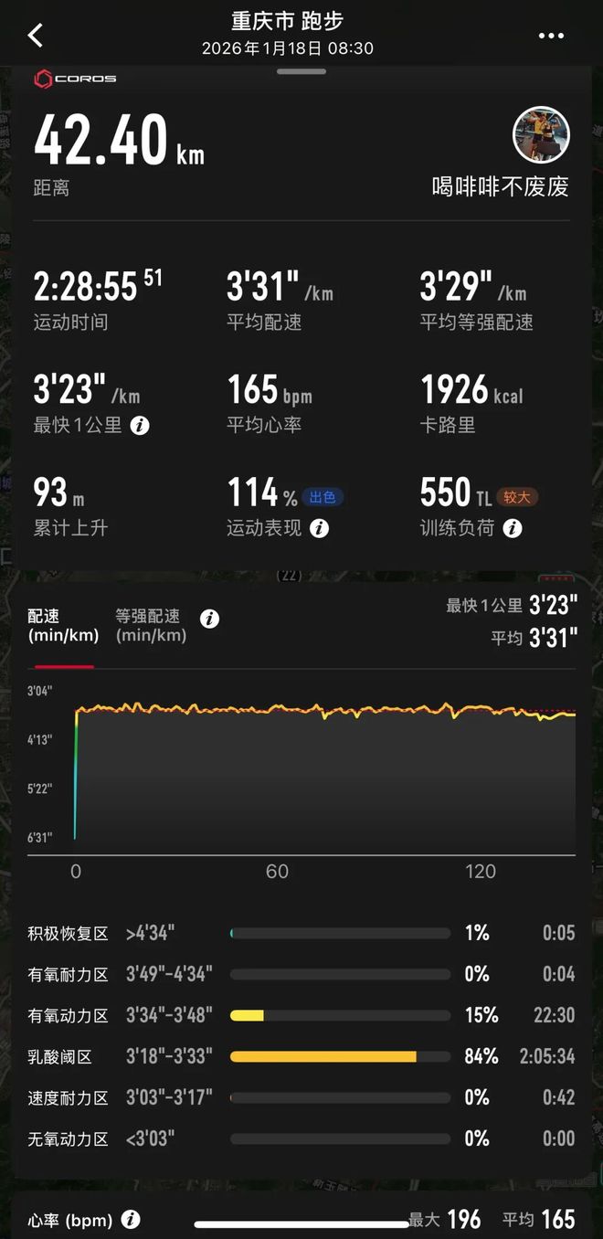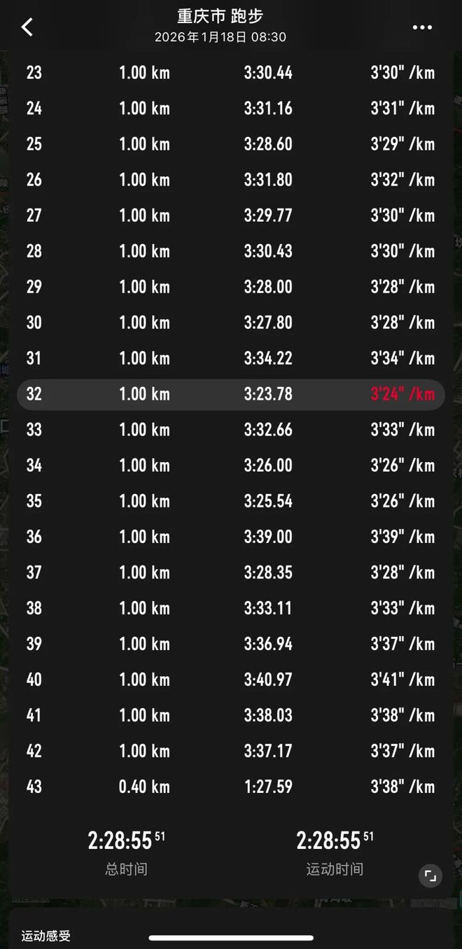 A第一反应——以后比赛策略还是得稳住,不能加太急,以后比赛慢慢攒经验,不要着急中间突然加速。我们也可能调整一下策略,或下次比赛尝试一下,努力到36或37公里后再加速更保险一点。我希望一场比赛能以比较好体感跑下来,不是到后半程要顶一公里。