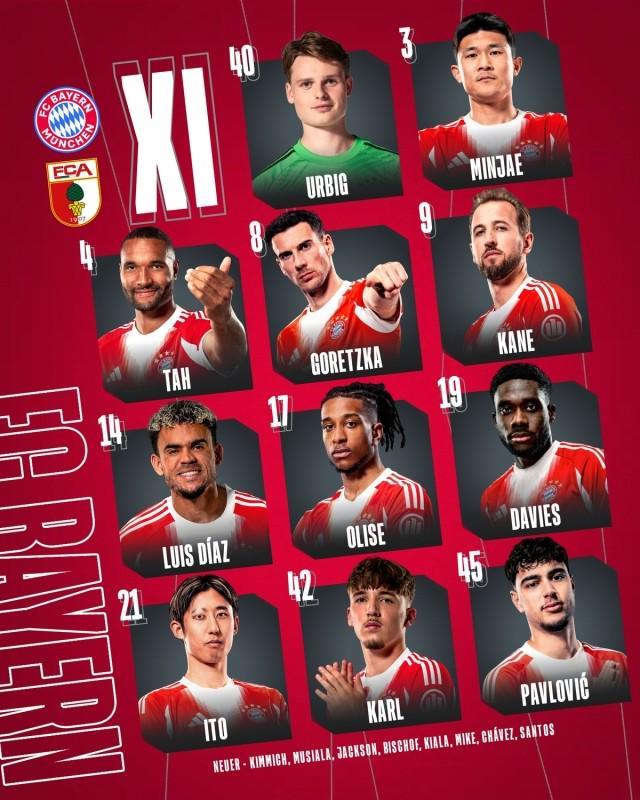 【首发】英式锋线领衔拜仁战奥堡英超 01-24 21:28德甲第19轮,拜仁慕尼黑主场迎战奥格斯堡。拜仁公布先发,凯恩、迪亚斯、奥利塞领衔锋线,日韩组合驻防,诺伊尔、基米希、穆西亚拉