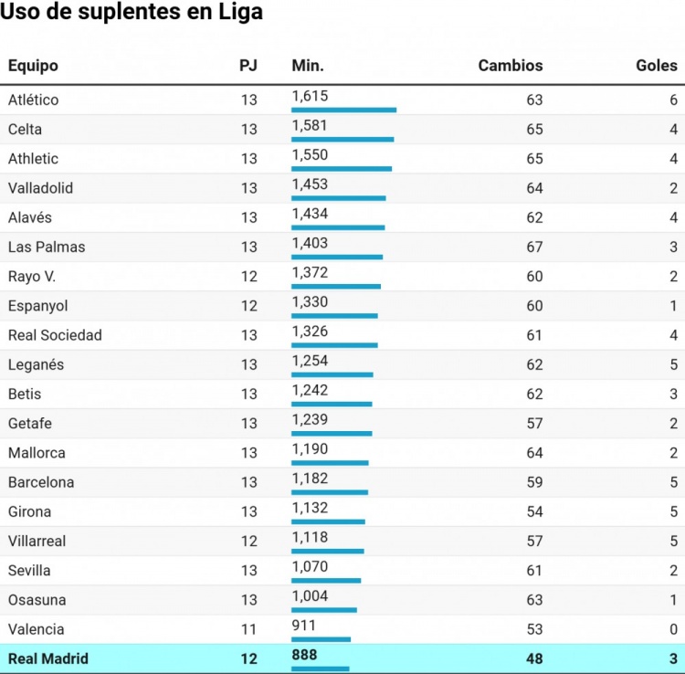 当西甲联赛进行到三分之一时,皇马是使用替补球员最少的球队,前12场联赛安切洛蒂总共换人48次,替补球员仅出场888分钟,他们在888分钟的出场时间里贡献了3个进球和5次助攻。