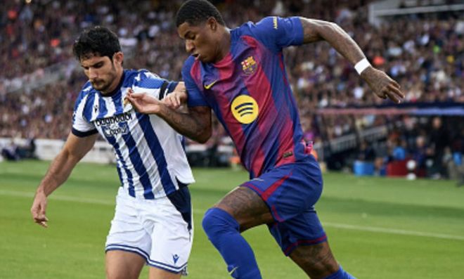 雷速体育10月5日讯 西甲第8轮,巴塞罗那客场对阵塞维利亚。上半场补时阶段,拉什福德为巴萨扳回一城,打入个人西甲首粒进球。