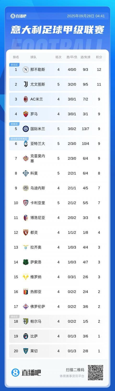 榜首那不勒斯未赛暂12分领跑,米兰未赛9分第3,本轮两队将直接对话。