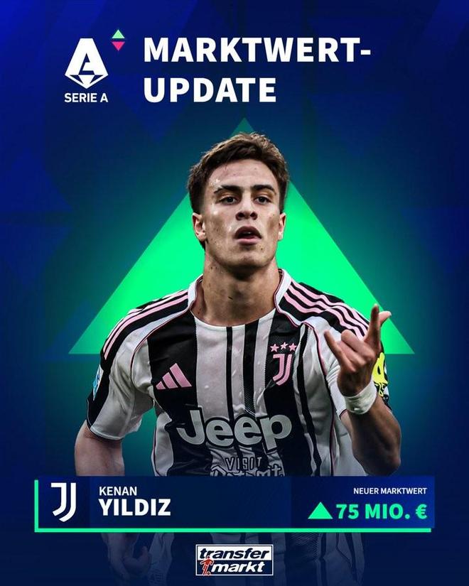 北京时间10月7日,在更新了意甲球员的身价之后,德转还列出了此次更新后身价排名前10的意甲U21球员,尤文图斯的凯南-伊尔迪兹以7500万欧元高居第一,国际米兰的皮奥-埃斯波西托3000万欧元并列第二。此外,被国际米兰外租的巴伦廷-卡尔博尼以及被AC米兰外租的卡马尔达也都进入前10之列。