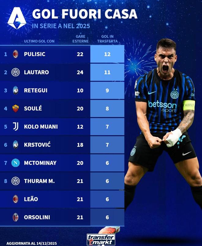 北京时间12月15日,德转列出了意甲2025年各项赛事客场比赛进球最多的10名球员,普利希奇22战打进12球排名第一,劳塔罗24战11球第二,已经离开意甲的雷特吉和科洛-穆阿尼上榜。意甲