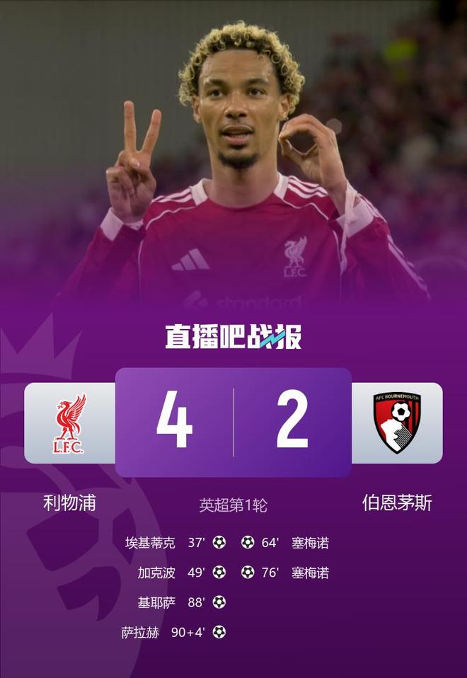 8月16日讯 25-26赛季英超揭幕战,卫冕冠军利物浦坐镇主场安菲尔德迎战伯恩茅斯。上半场,萨拉赫、范迪克造险,埃基蒂克连场破门并致敬若塔。易边再战,埃基蒂克助攻加克波建功,塞梅诺双响,小基耶萨替补绝杀,萨拉赫锁定胜局。最终利物浦4-2伯恩茅斯收获开门红。