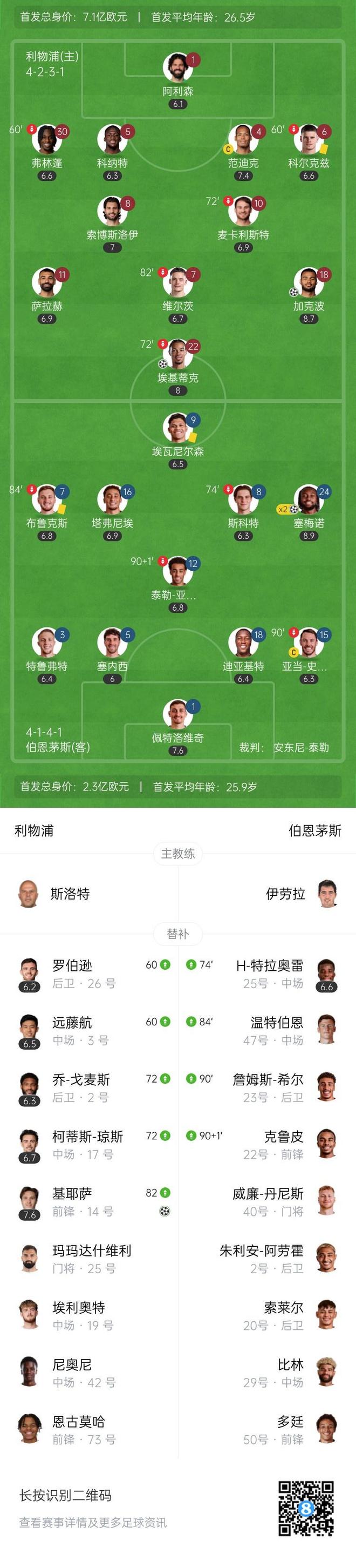 下半场补时6分钟。最终全场比赛结束,利物浦4-2伯恩茅斯。