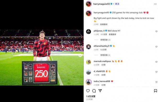 马奎尔赛后晒图并配文:“这家伟大的俱乐部出战250场❤️小伙子们今天在大战中展现了斗志,是时候继续前进了!”