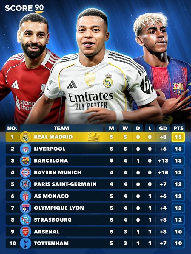 你的主队在哪五大联赛合体积分榜:皇马利物浦5轮全胜领跑