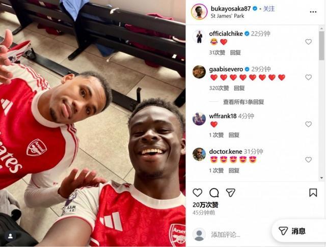 笑得灿烂!萨卡社媒晒和加布里埃尔合照庆祝21逆转纽卡