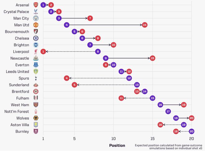 雷速体育10月1日讯 今日,国外知名数据机构公布了一项英超联赛前六轮预期积分排名的数据结论,其中目前位列榜首的利物浦期望排名仅位列第八,而排名第二的阿森纳期望排名是英超