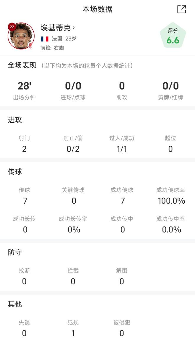 雷速体育10月20日讯 在今天凌晨结束的英超双红会中,利物浦前锋埃基蒂克替补出场28分钟未能救主。埃基蒂克战曼联全场数据:出场28分钟;1次过人尝试,1次成功;2次射门,2次射偏;7次传