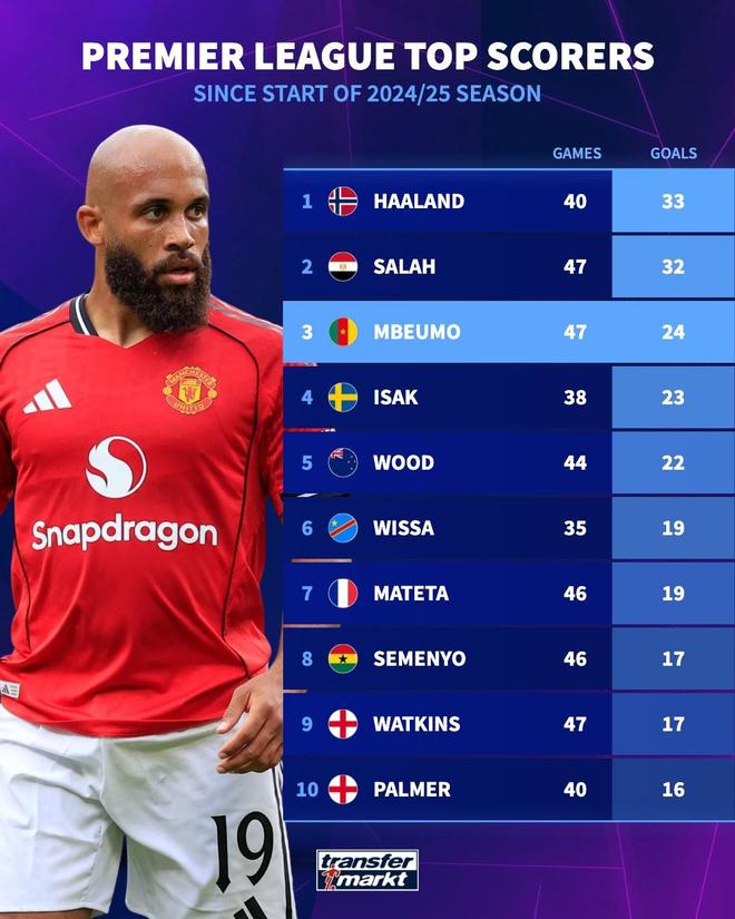 北京时间10月31日,德转统计出了上赛季至今英超联赛进球最多的10名球员,哈兰德33球排名第一,萨拉赫32球第二,本赛季为曼联在联赛中9场打进4球的姆伯莫位列第三。上赛季至今英超联