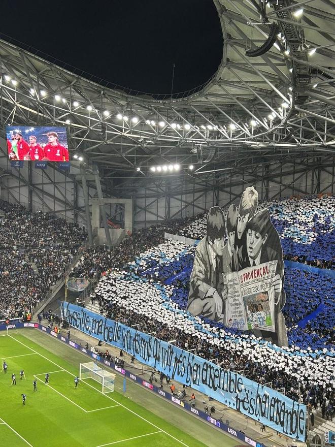 欧冠联赛阶段第7轮,马赛主场对阵利物浦,赛前,马赛主场看台打出了致敬披头士的TIFO。