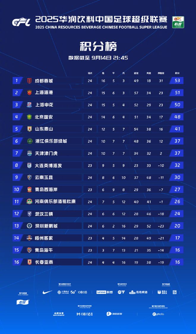 中超第24轮,成都蓉城1-0战胜长春亚泰,当轮比赛全部结束后,蓉城积53分名列中超榜首,领先身后的海港2分。但随后他们打平了申花、浙江队和青岛西海岸,仅在第27轮战胜了梅州客家。关键阶段连续的丢分,以及今天的输球,让蓉城彻底无缘本赛季中超冠军。